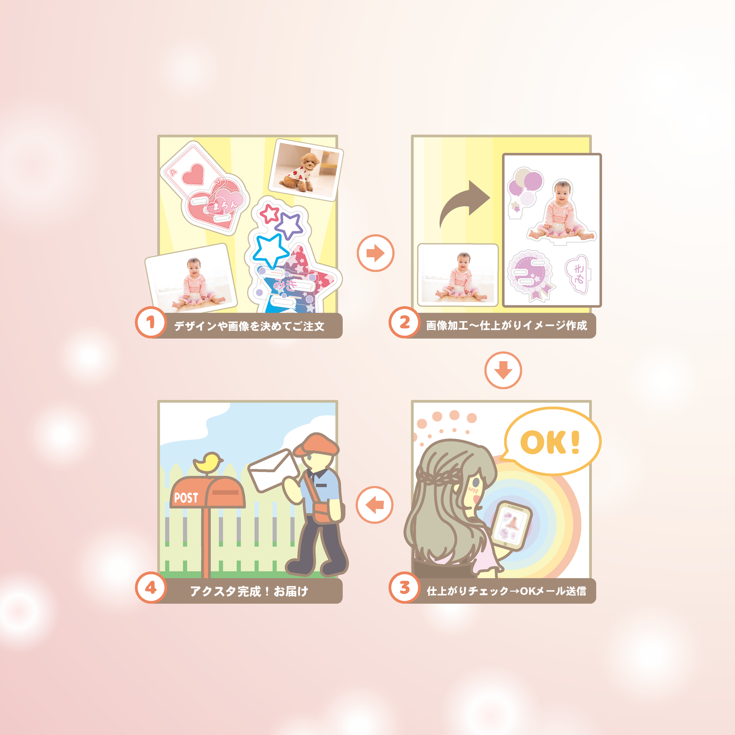 ご注文確定(コンビニ決済の場合はお支払い確定後)1~2営業日以内に、切り抜き加工した画像をご指定のメールアドレスにお送りいたします。ご確認いただけましたら『OK』のお返事をお願いします!